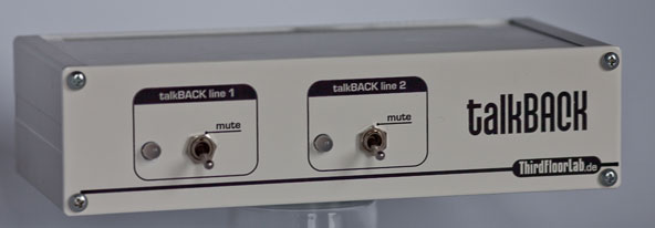 You may connect 2 preamped microphones in the recording room to establish talkback facilities. The unit has 2 independent passive switching line, so it could also be used to switch on an talkback